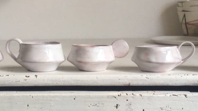 As light as a sheet of paper, both the cup and the plate feature a contemporary functional unique design. Each set (cup+plate) is handcrafted, thus it varies from one another. Shapes are irregular and imperfect. The artist added a one-off piece with a beautifully-modelled eccentric handle.
